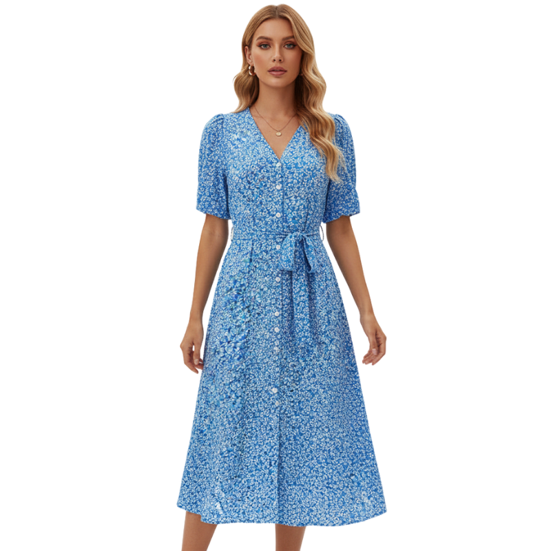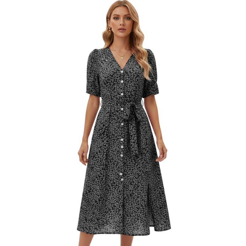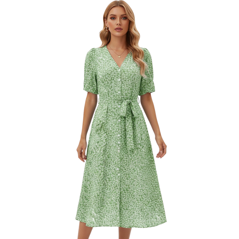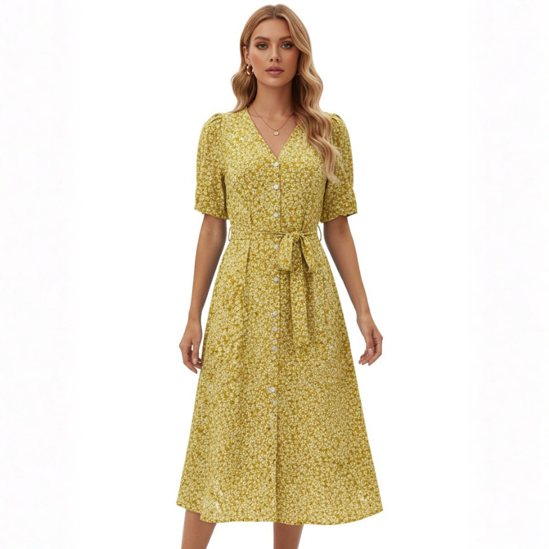 Klänning Midi Dam Knappar V Hals Kortärmad
